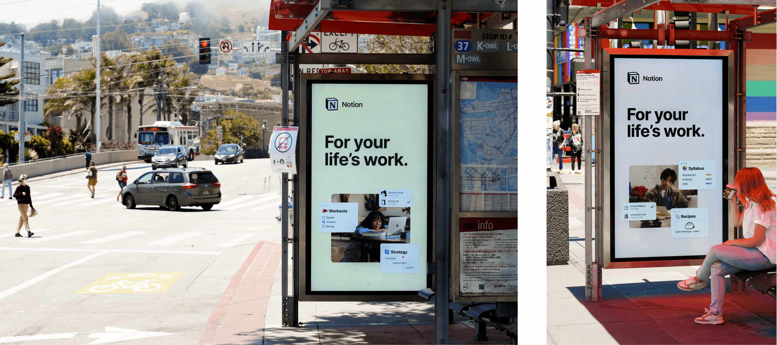 You’ve shown us that work and life don’t fit into two neat boxes. Instead, it’s about being able to work the way you want, and prioritize what’s important. We want Notion’s brand to represent that flexibility to do what’s most meaningful to you. So today, we’re thrilled to unveil our first international brand campaign, For your life’s work.